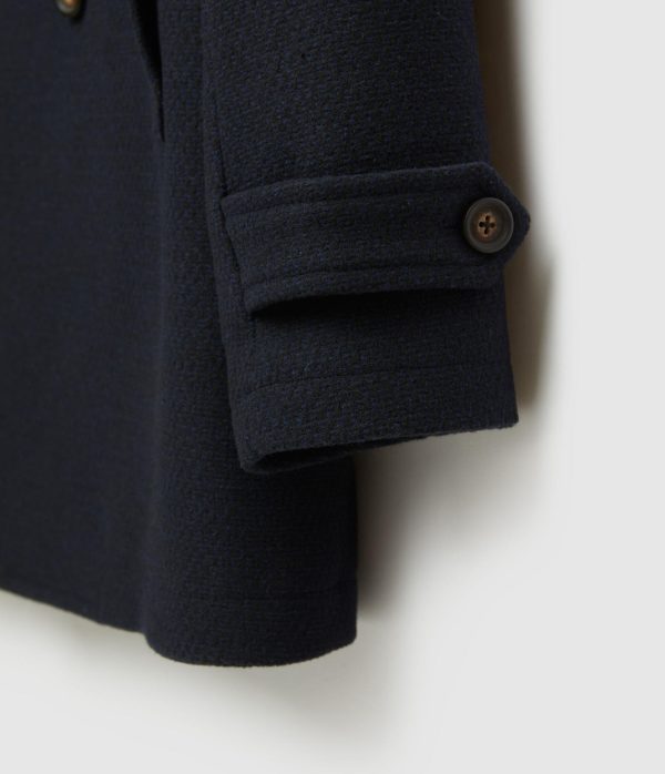 Abrigo de corte regular fit que cuenta con cuello y solapa, cierre central cruzado mediante botonadura en efecto madera y dos bolsillos en la cintura. Abertura en el centro de la espalda. Forrado en su interior con dos bolsillos.
