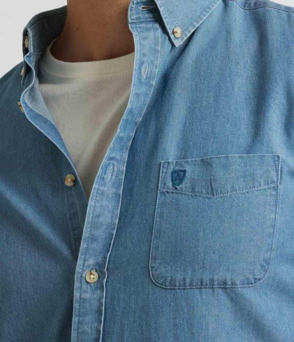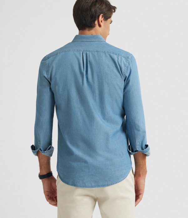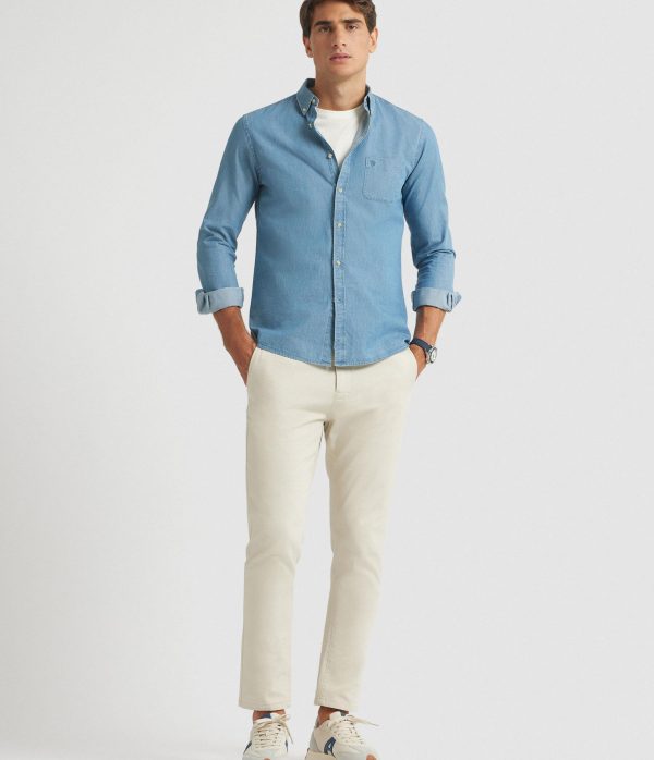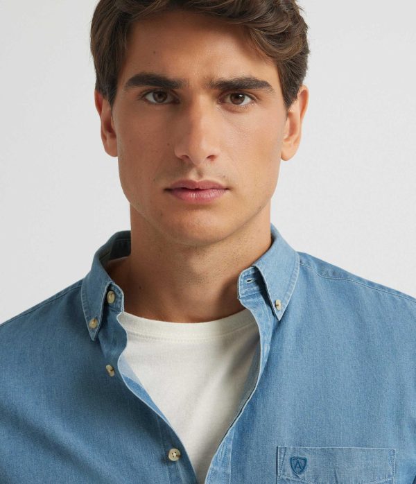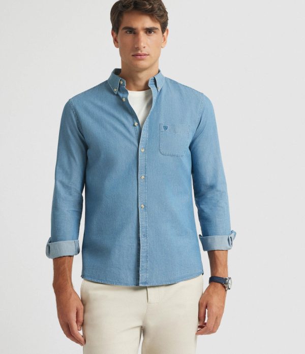 Camisa estilo denim con cuello clásico de botón, bolsillo en el frontal con logo de la marca grabado y manga larga con puños simples. Corte regular fit.