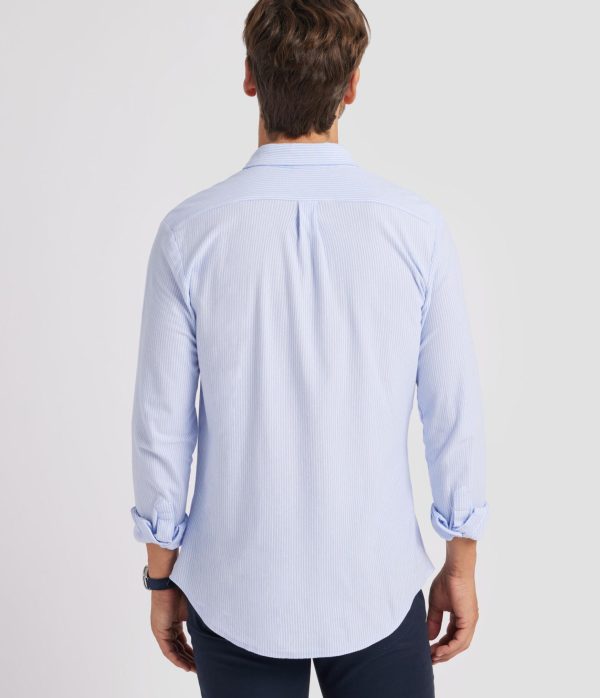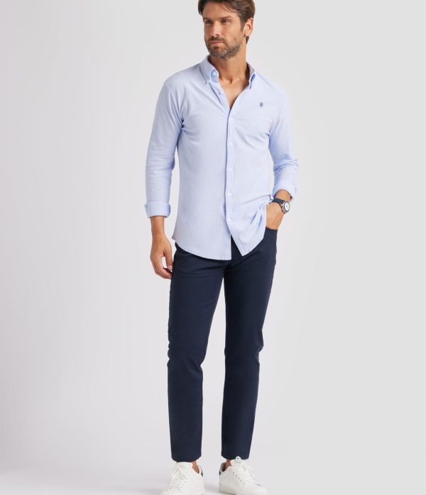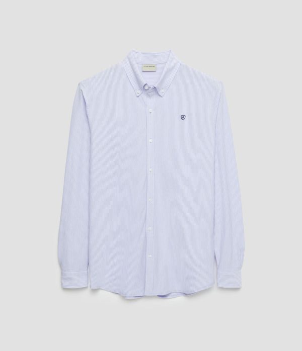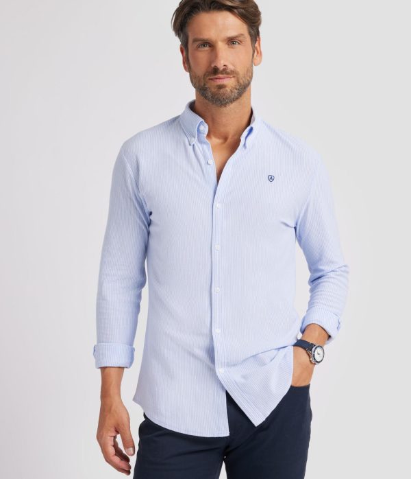 Camisa casual a rayas confeccionada en tejido de punto. Cuenta con cuello clásico de botón, manga larga con puños simples y logo de la marca grabado en el frontal. Corte regular fit.