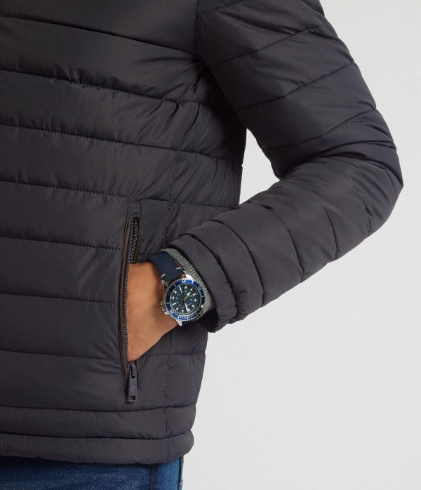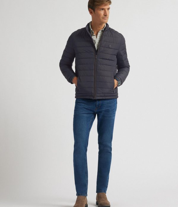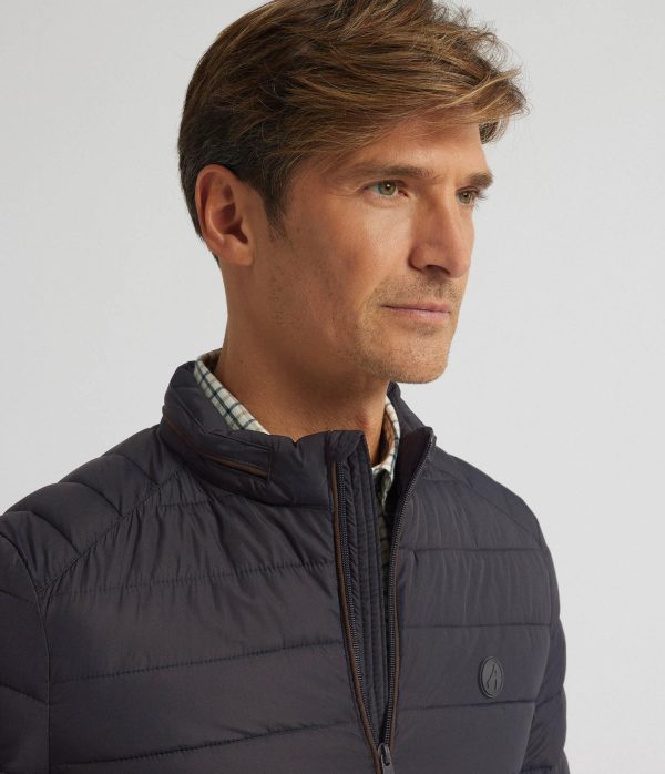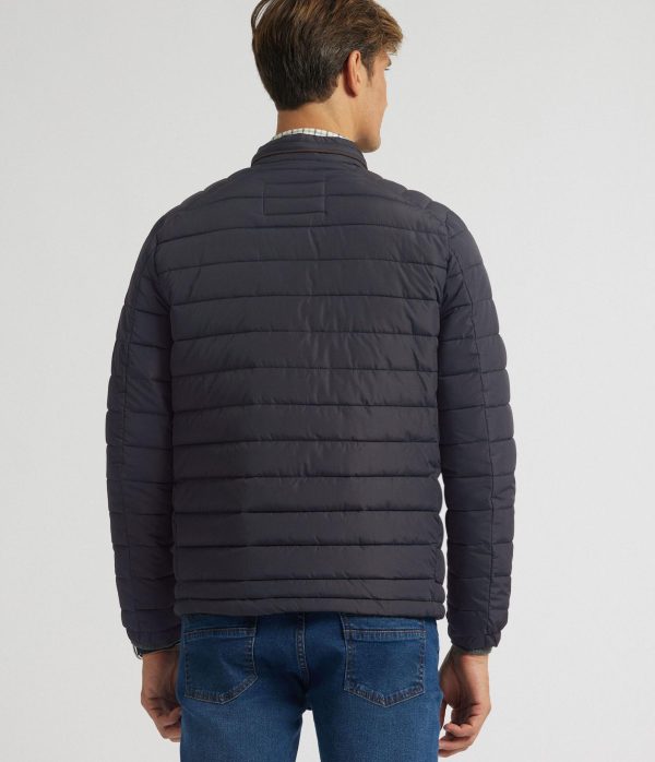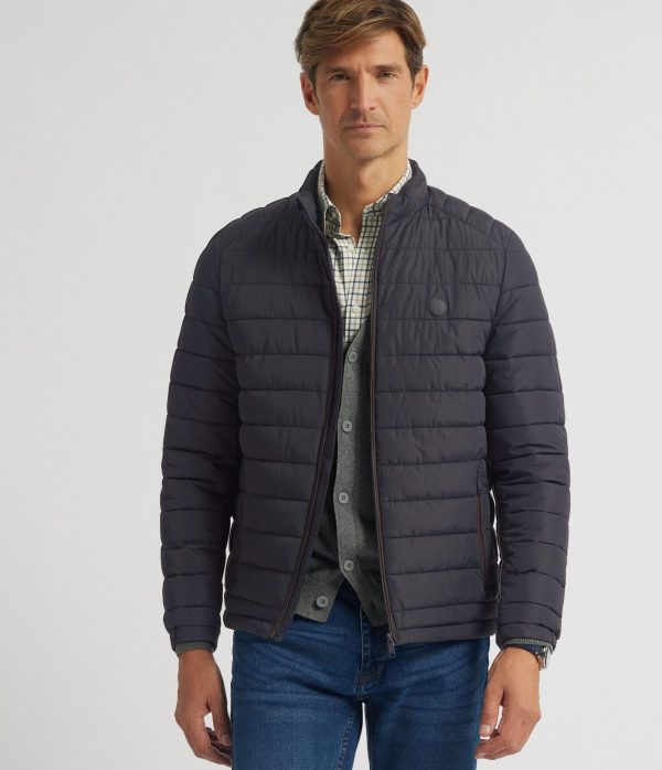 Cazadora acolchada con cuello subido y cremallera alrededor como detalle. Cierre central de cremallera, dos bolsillos en la cintura y logo grabado en el frontal. Interior forrado y viveado con bolsillo.