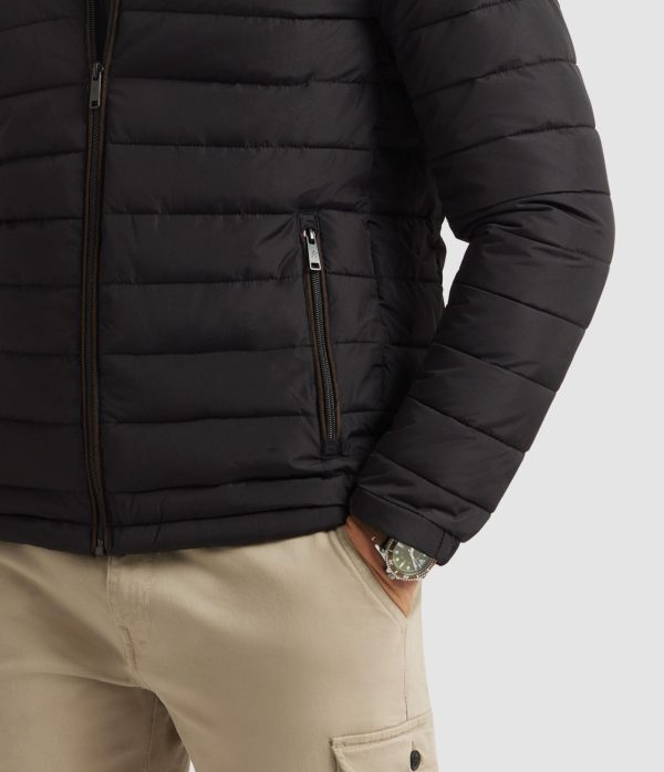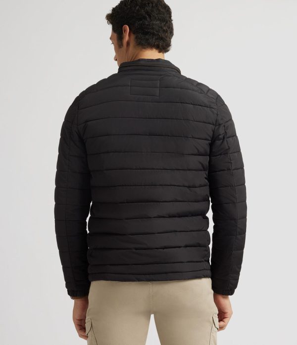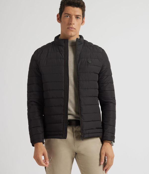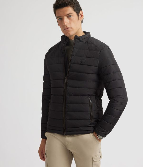 Cazadora acolchada con cuello subido y cremallera alrededor como detalle. Cierre central de cremallera, dos bolsillos en la cintura y logo grabado en el frontal. Interior forrado y viveado con bolsillo.