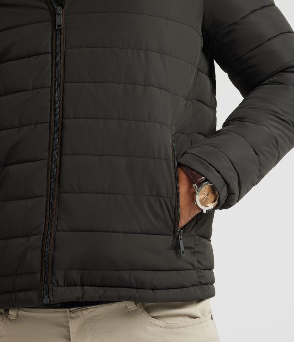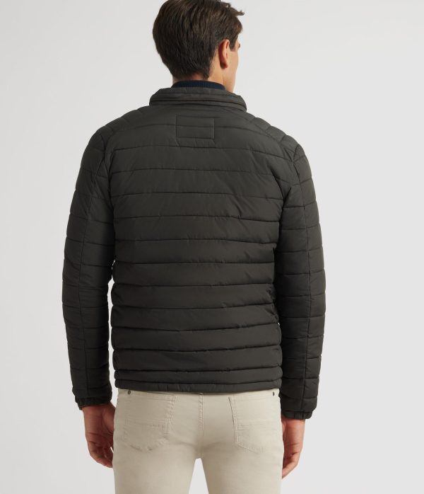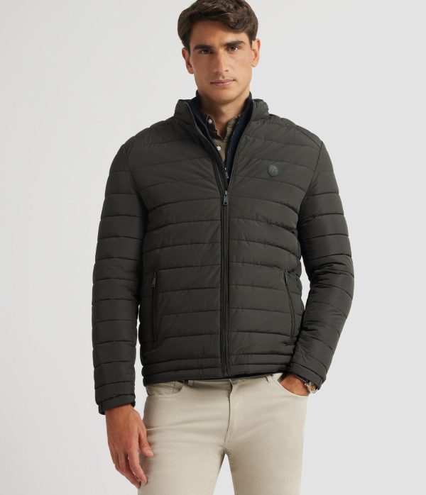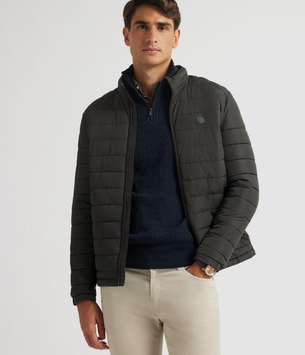 Cazadora acolchada con cuello subido y cremallera alrededor como detalle. Cierre central de cremallera, dos bolsillos en la cintura y logo grabado en el frontal. Interior forrado y viveado con bolsillo.