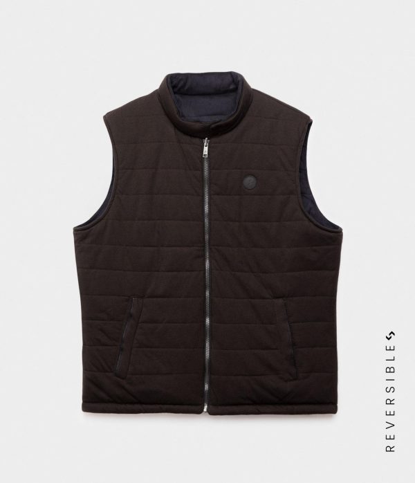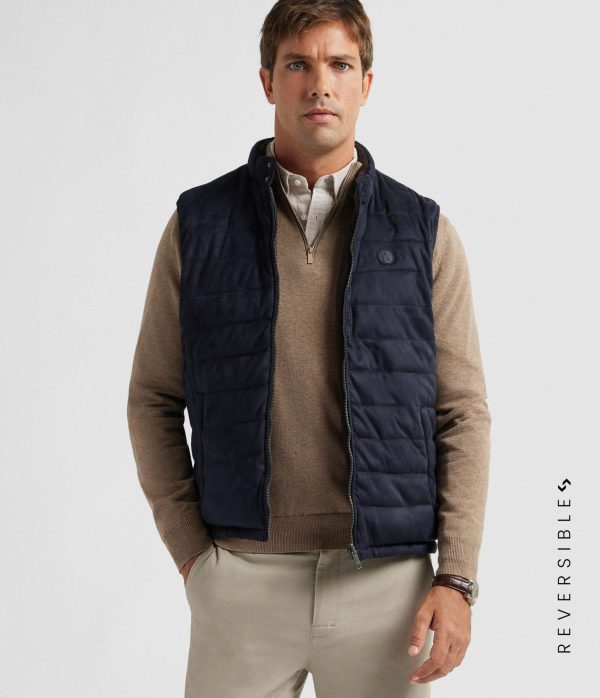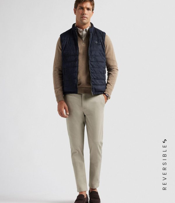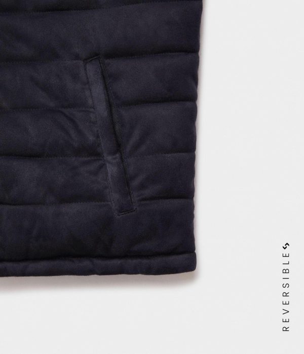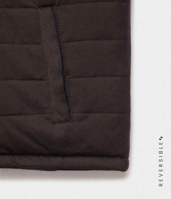 Chaleco acolchado reversible de corte regular fit. Cierre central mediante cremallera, dos bolsillos en la cintura y logo de la marca grabado en el frontal por ambos lados. Cuello con cierre mediante botones a presión por ambos lados.