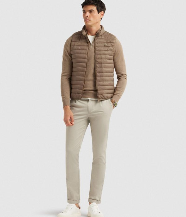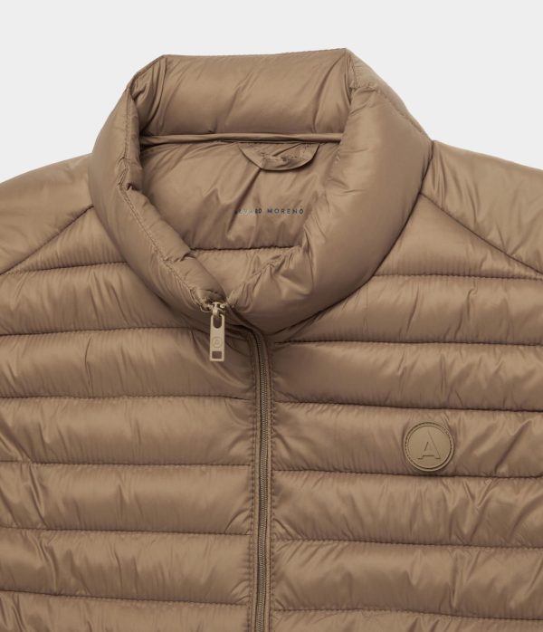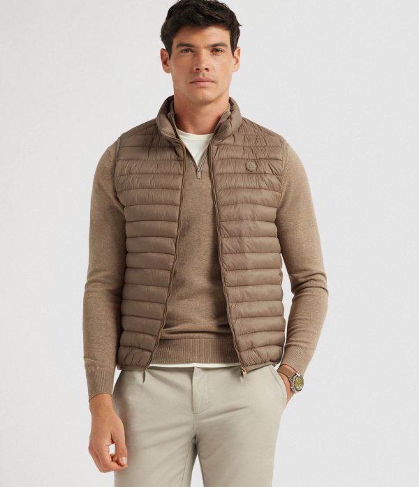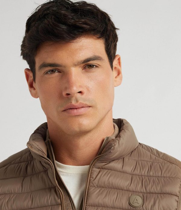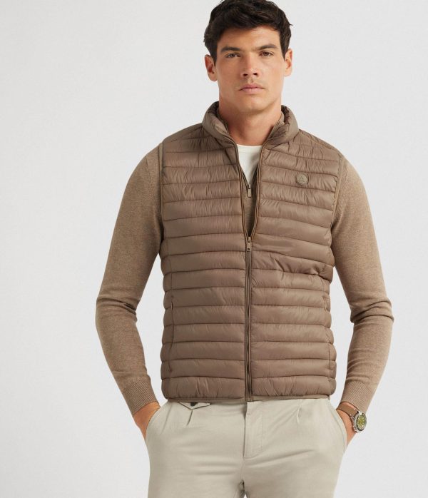 Chaleco acolchado con cuello subido y cierre central mediante cremallera, dos bolsillos a la altura de la cintura y logo de la marca grabado en el pecho. Elástico en la sisa y cintura. Forro interior a contraste con bolsillos.