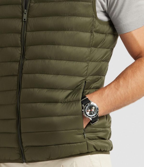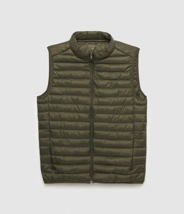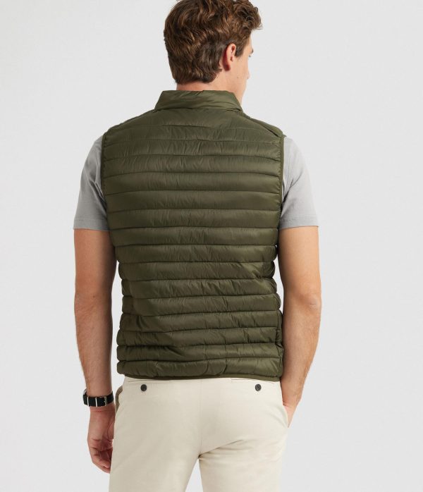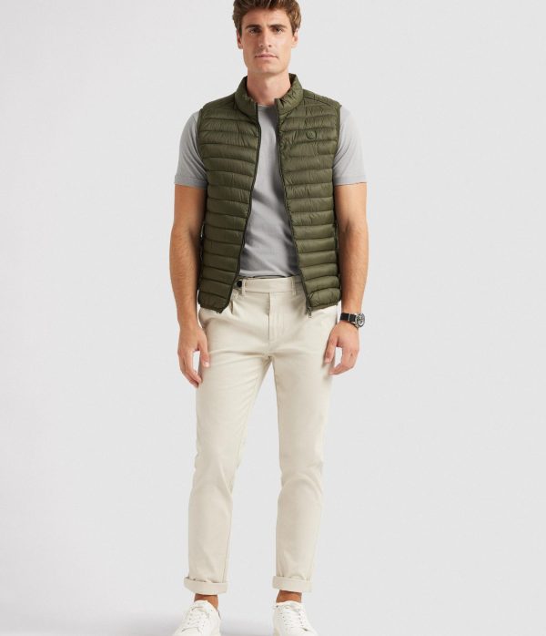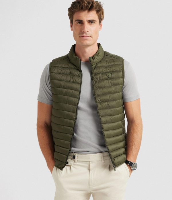 Chaleco acolchado con cuello subido y cierre central mediante cremallera, dos bolsillos a la altura de la cintura y logo de la marca grabado en el pecho. Elástico en la sisa y cintura. Forro interior a contraste con bolsillos.