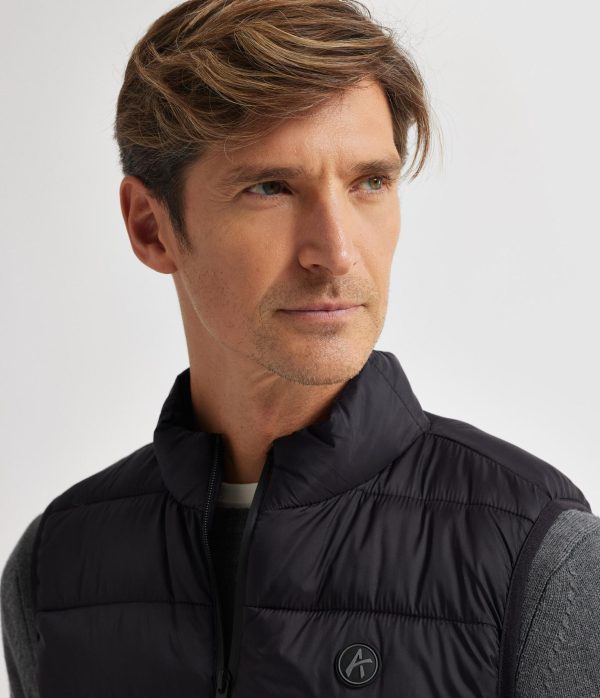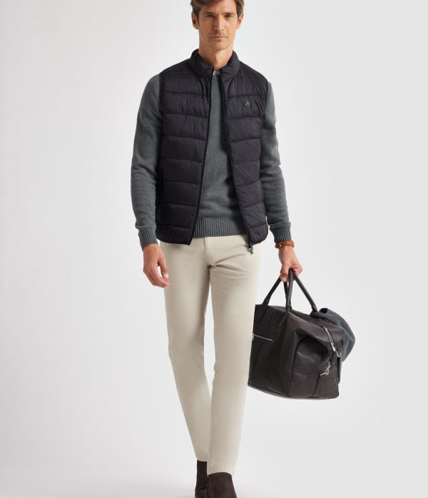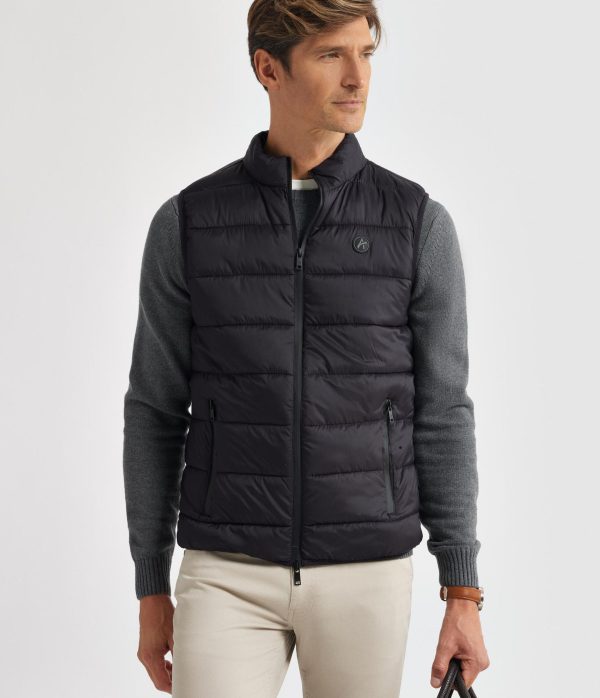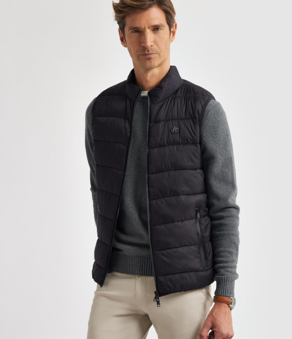 Chaleco acolchado con cuello subido y cierre central mediante doble cremallera, dos bolsillos a la altura de la cintura con cierre de cremallera y logo de la marca grabado en el frontal a contraste. Etiqueta personalizada en el lateral. Elástico en la sisa y cintura. Forro interior a contraste con dos bolsillos y doble compartimento cada uno.