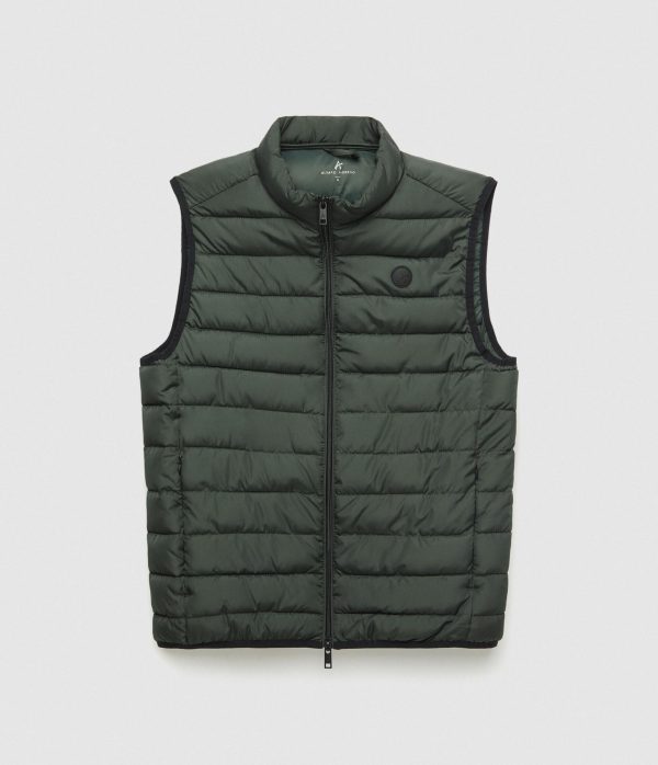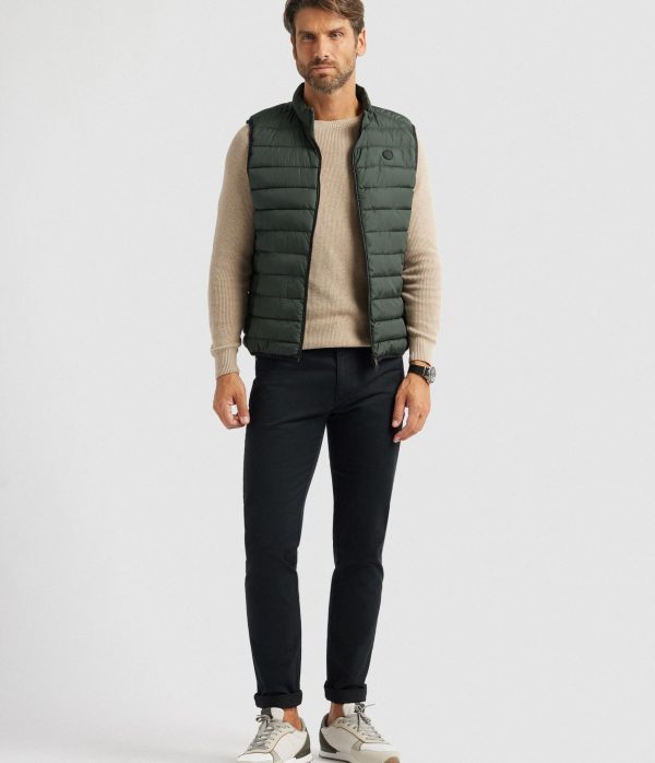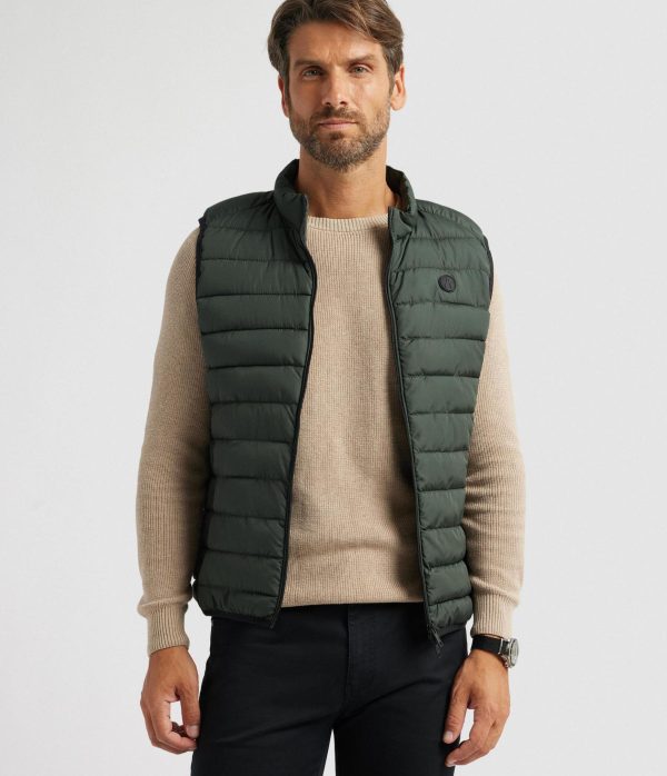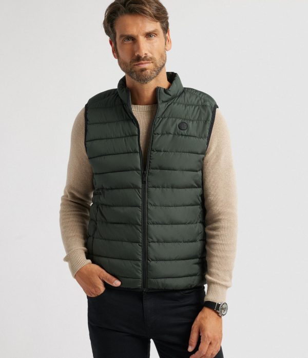 Chaleco acolchado con cuello subido y cierre central mediante cremallera, dos bolsillos a la altura de la cintura y logo de la marca grabado en el frontal. Elástico en la sisa y cintura. Forro interior al tono con bolsillos.