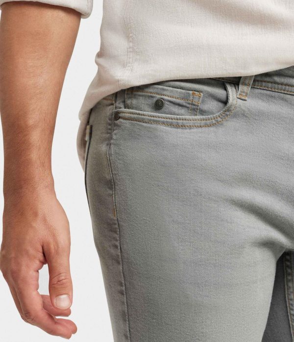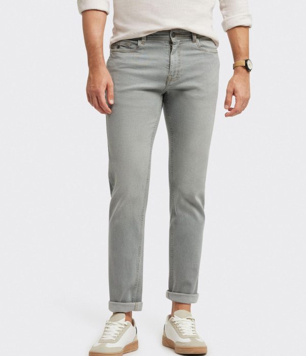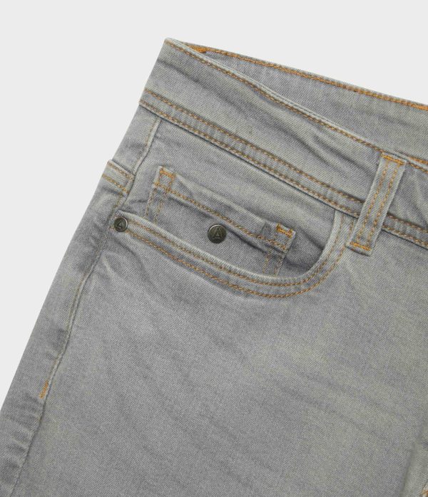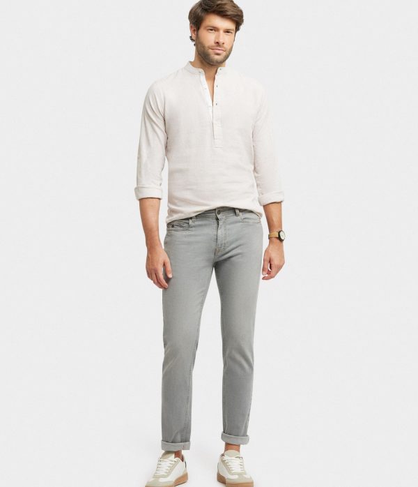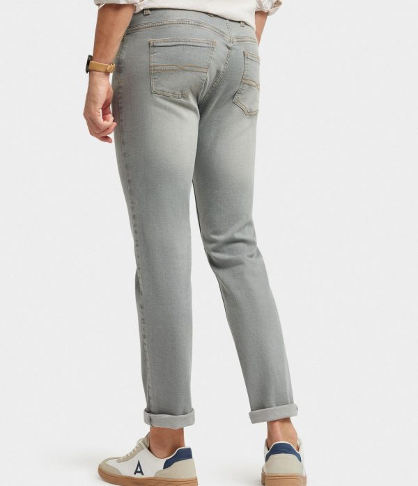 Pantalón denim de corte regular fit con cinco bolsillos y efecto desgastado. Cierre central mediante botón y cremallera, pespuntes en color camel, fornituras personalizadas y etiqueta en efecto piel en la cinturilla.