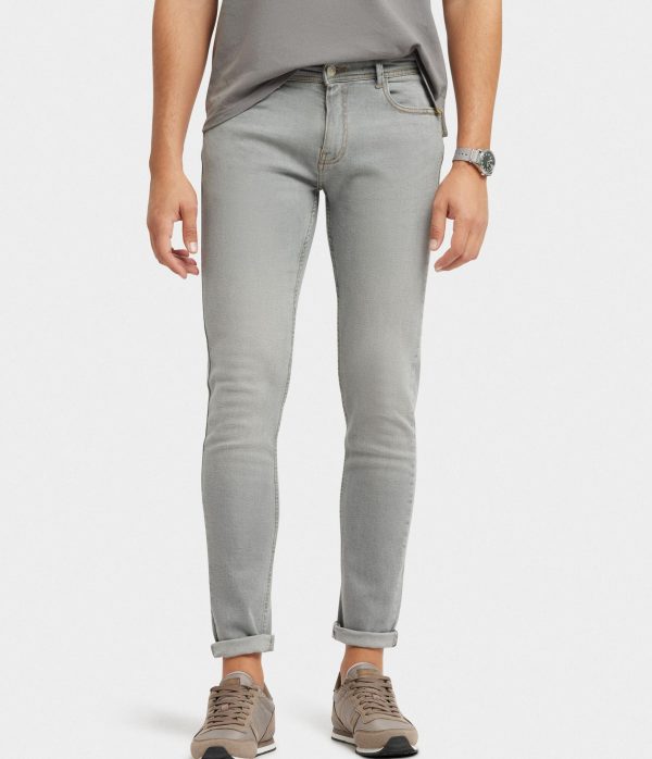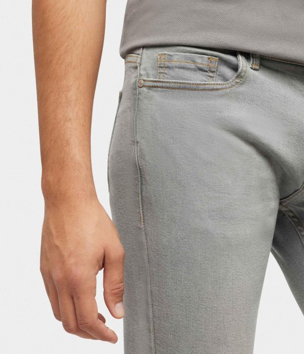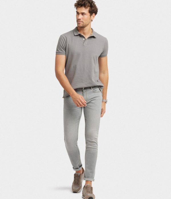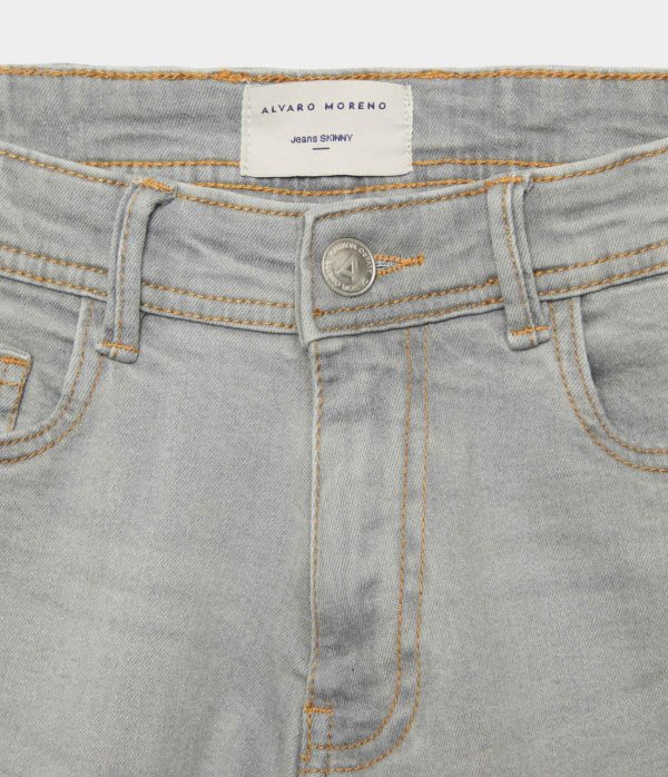 Pantalón denim de corte skinny fit con cinco bolsillos. Cierre central mediante botón y cremallera, pespuntes en color camel, fornituras personalizadas y etiqueta en efecto piel en la cinturilla.