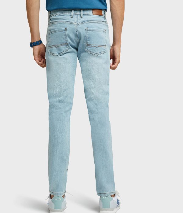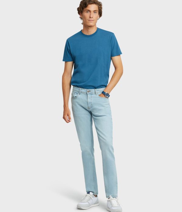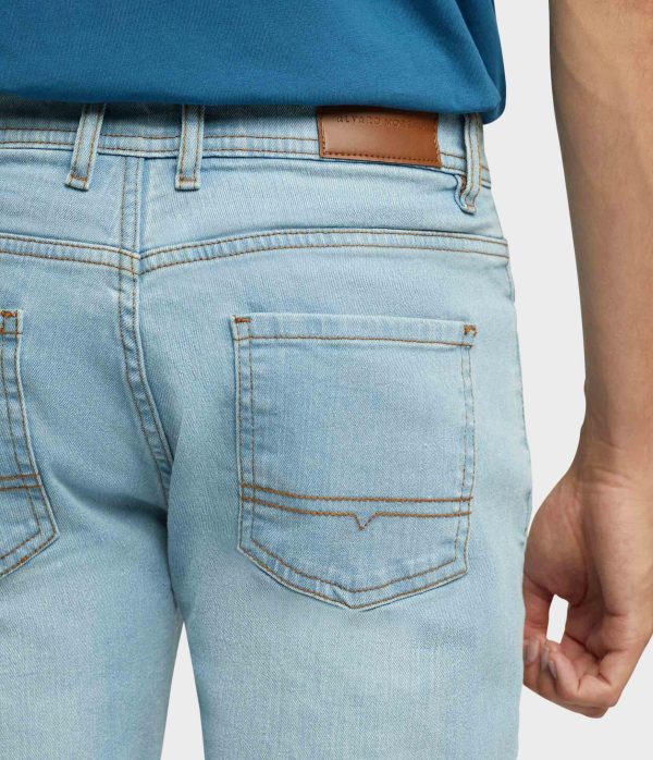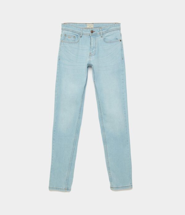 Pantalón denim de corte slim fit con cinco bolsillos. Cierre central mediante botón y cremallera, pespuntes en color camel, fornituras personalizadas y etiqueta en efecto piel en la cinturilla.