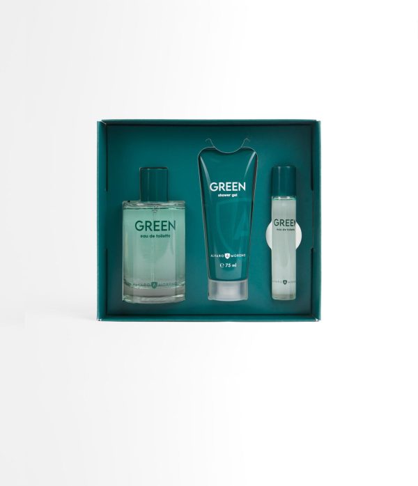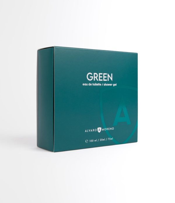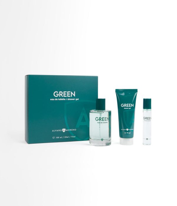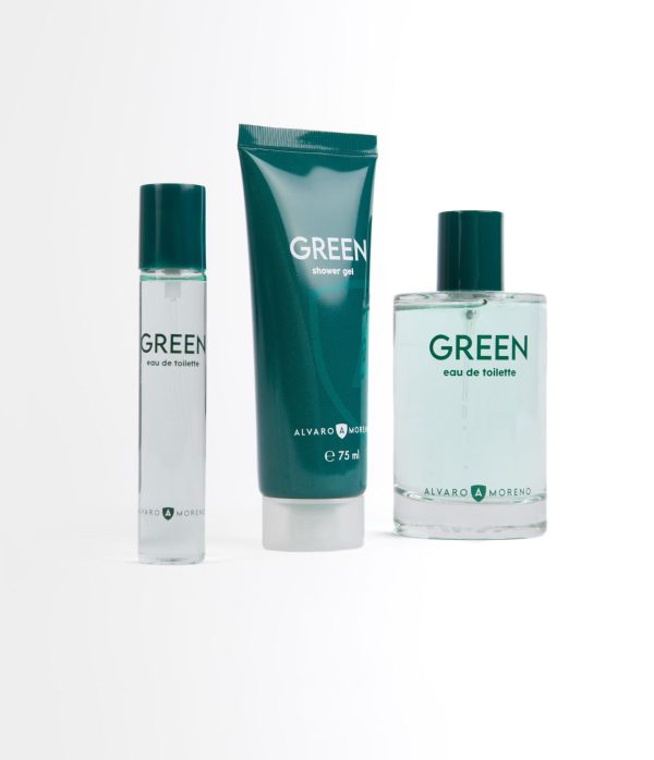 Estuche compuesto por nuestro Perfume AM Green de 100 ml, Gel de Baño de 75 ml y Perfume Am Green de 20 ml para viaje.