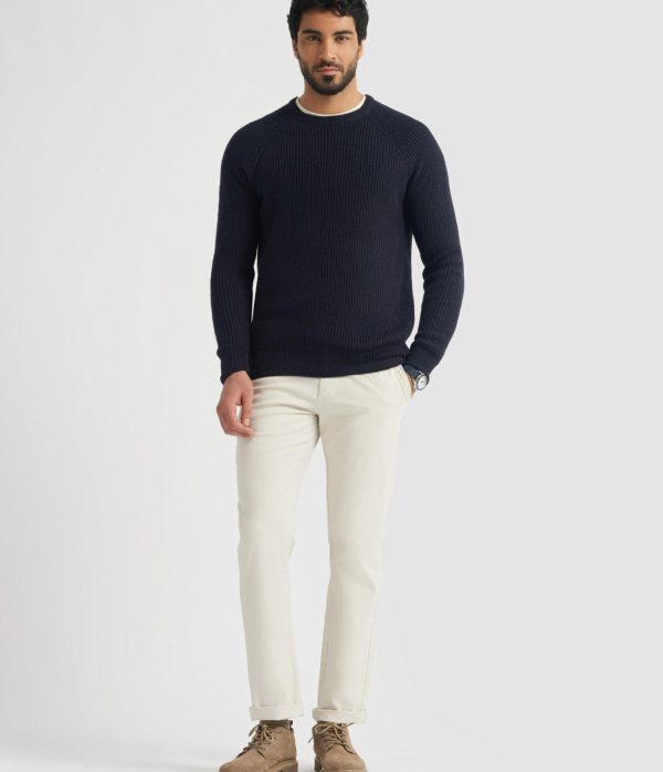 Jersey con corte ranglan en sus mangas, cuello redondo, manga larga y detalle personalizado en el bajo. Cuello, puños y bajo en acabado ribeteado.