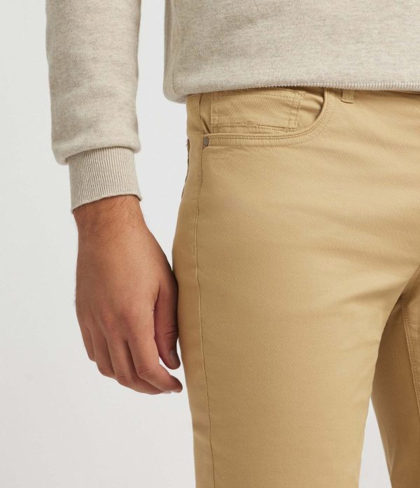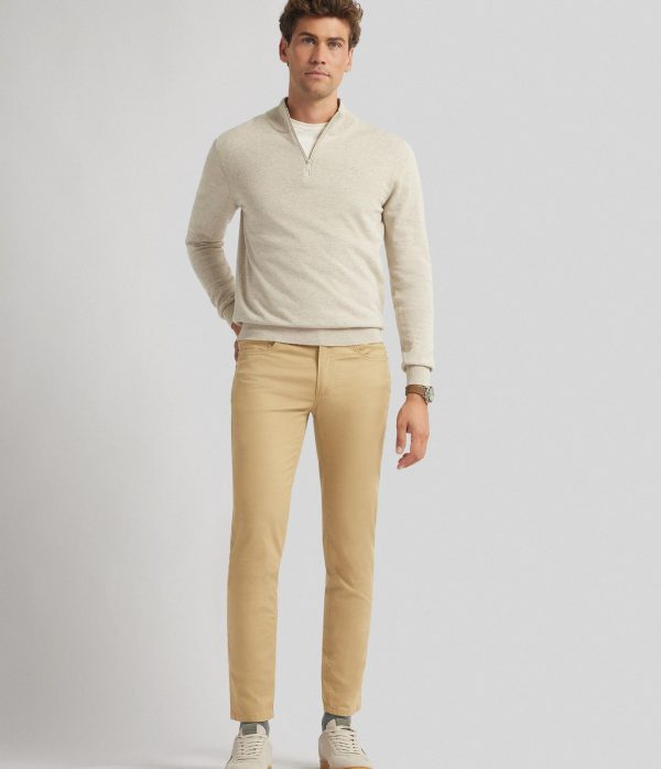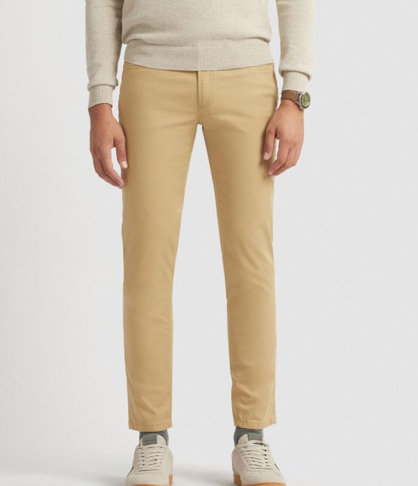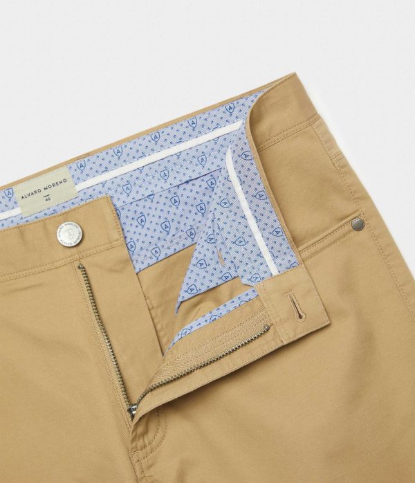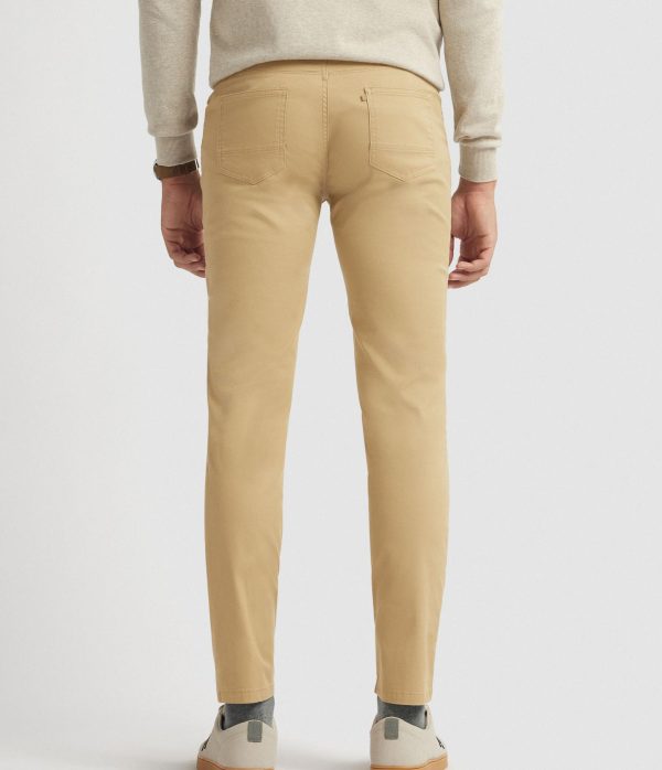 Pantalón de corte slim fit con 5 bolsillos. Cierre delantero mediante cremallera y botón, dos bolsillos en el lateral, un bolsillo cerillero y dos bolsillos tipo parche en la parte trasera con etiqueta personalizada en la cinturilla.