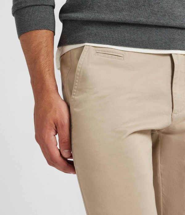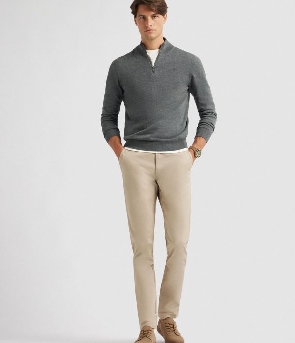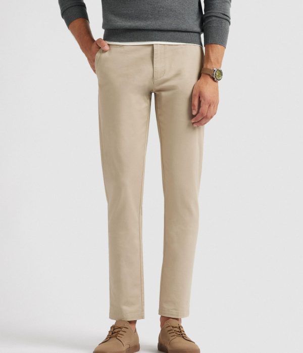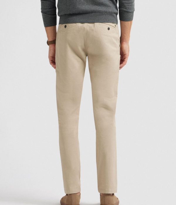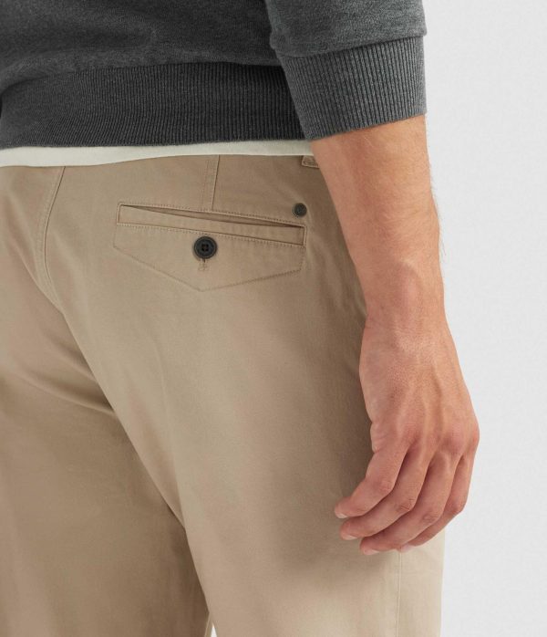 Pantalón estilo chino de corte slim fit. Cierre central de botón y cremallera, dos bolsillos en el lateral, un bolsillo en el frontal y dos bolsillos tipo chino con cierre de botón en la parte trasera.