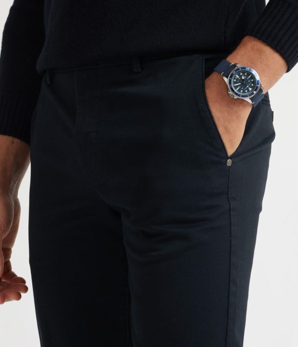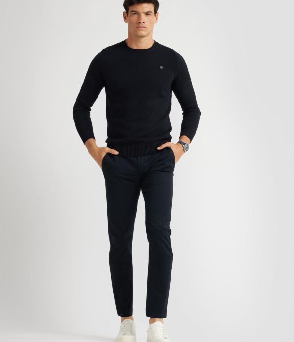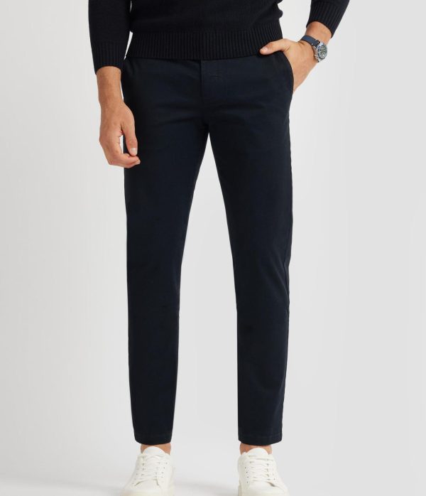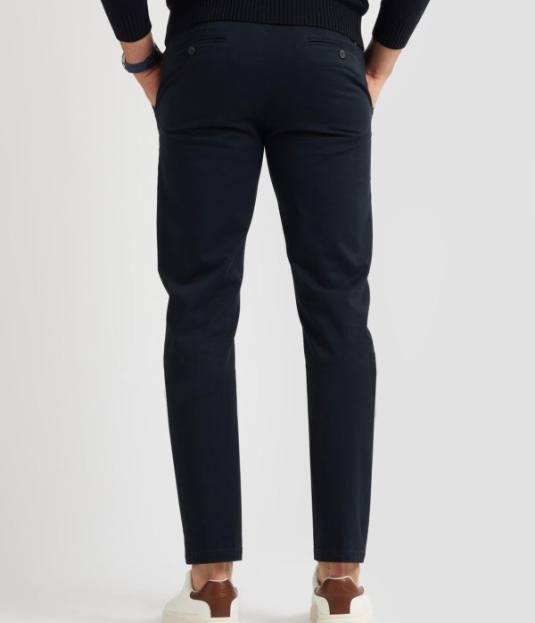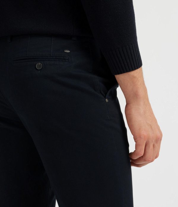 Pantalón estilo chino de corte slim fit. Cierre central de botón y cremallera, bolsillos tipo chino en la parte trasera y detalle personalizado sobre uno de los bolsillos.