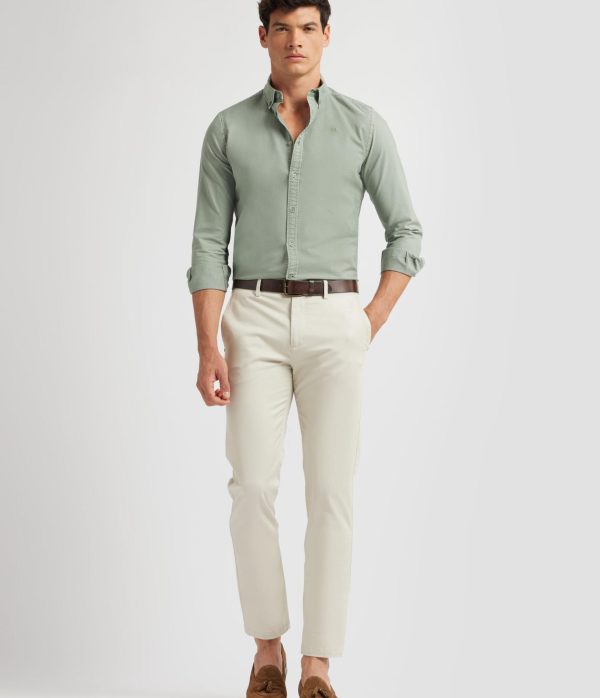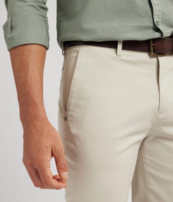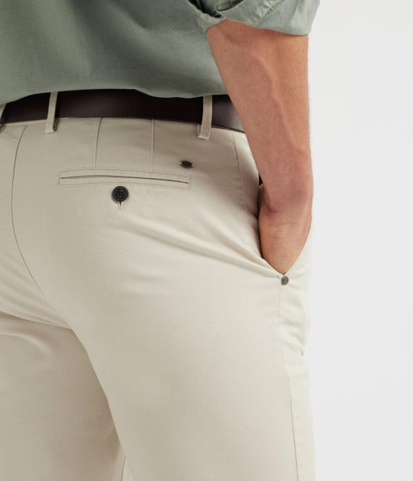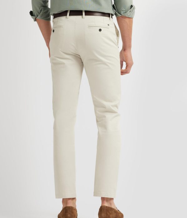 Pantalón estilo chino de corte slim fit. Cierre central de botón y cremallera, bolsillos tipo chino en la parte trasera y detalle personalizado sobre uno de los bolsillos.