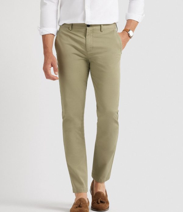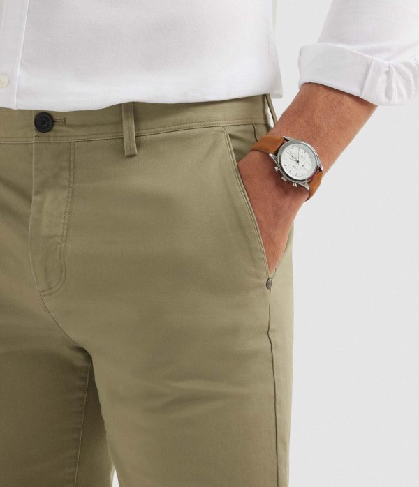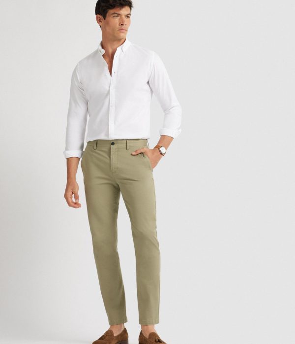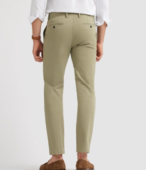 Pantalón estilo chino de corte slim fit. Cierre central de botón y cremallera, bolsillos tipo chino en la parte trasera y detalle personalizado sobre uno de los bolsillos.
