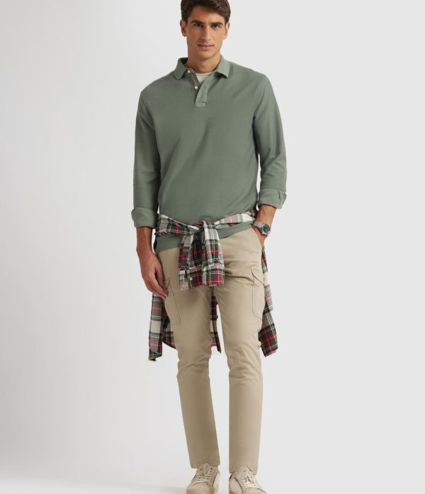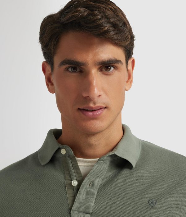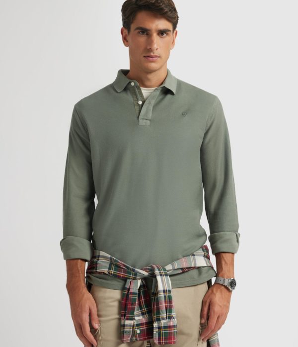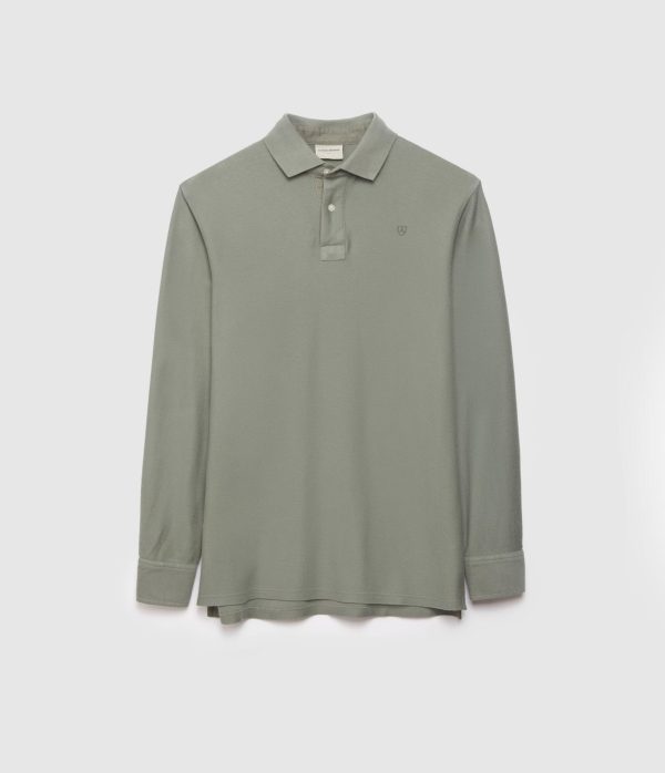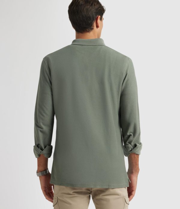 Polo liso de manga larga con cuello clásico y cierre de tapeta de dos botones al tono. Logo grabado en el frontal, puños con puños ajustables y aberturas en la parte inferior. Corte regular fit.