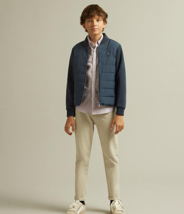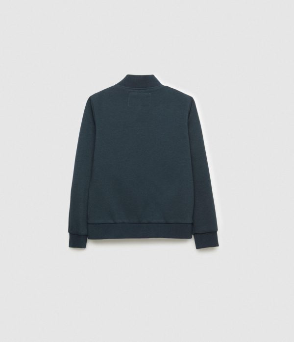 Cazadora estilo bomber con cuello y mangas en tejido de punto. Cuenta en su parte delantera con cierre central mediante cremallera, dos bolsillos y parche con el logo de la marca grabado en el pecho.