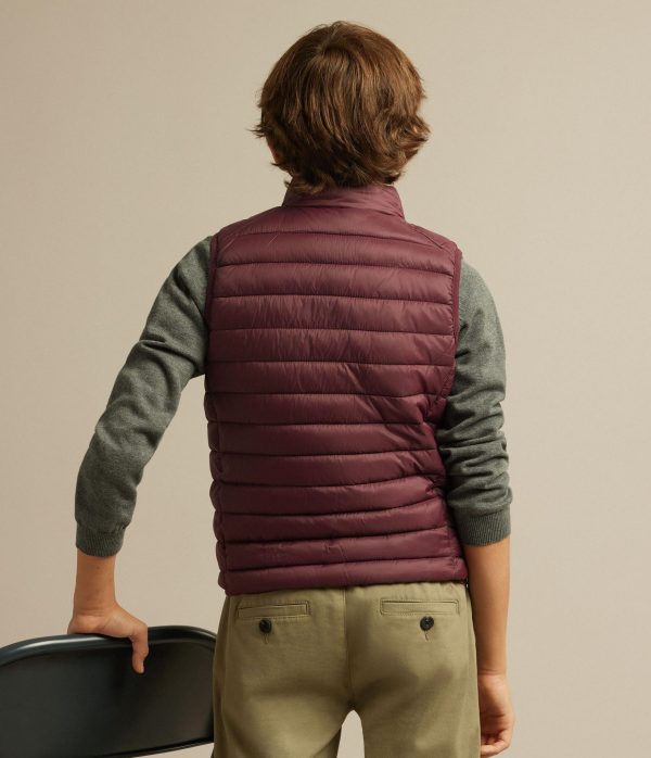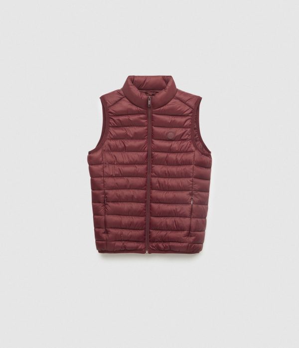 Chaleco acolchado con cuello subido y cierre central mediante cremallera, dos bolsillos a la altura de la cintura y logo de la marca grabado en el pecho. Elástico en la sisa y cintura. Forro interior a contraste con bolsillos.