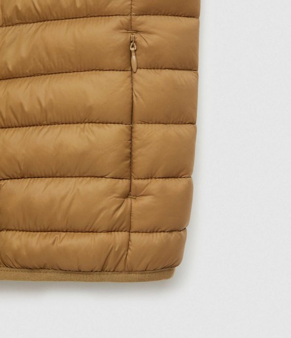 Chaleco acolchado con cuello subido y cierre central mediante cremallera, dos bolsillos a la altura de la cintura y logo de la marca grabado en el pecho. Elástico en la sisa y cintura. Forro interior a contraste con bolsillos.