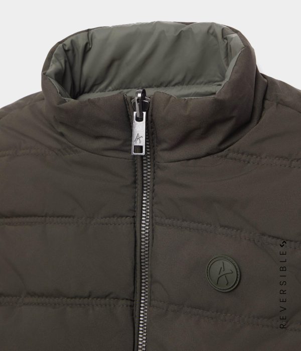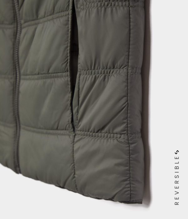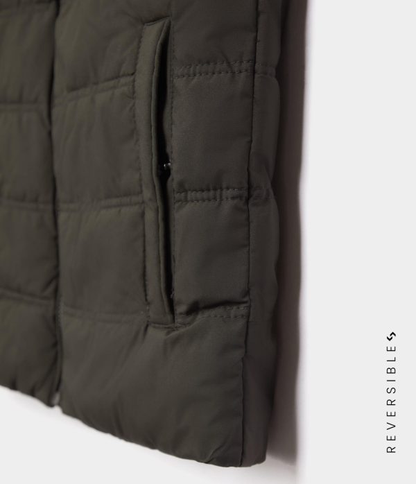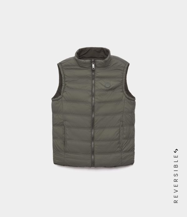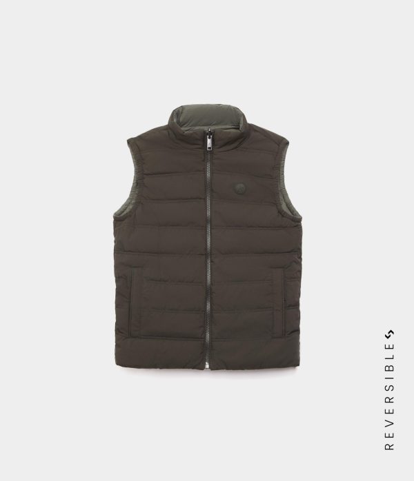 Chaleco reversible que cuenta con cuello subido, cierre central mediante cremallera, dos bolsillos en la cintura en ambos lados y logo de la marca grabado a la altura del pecho. Elástico en la sisa. Corte regular fit.
