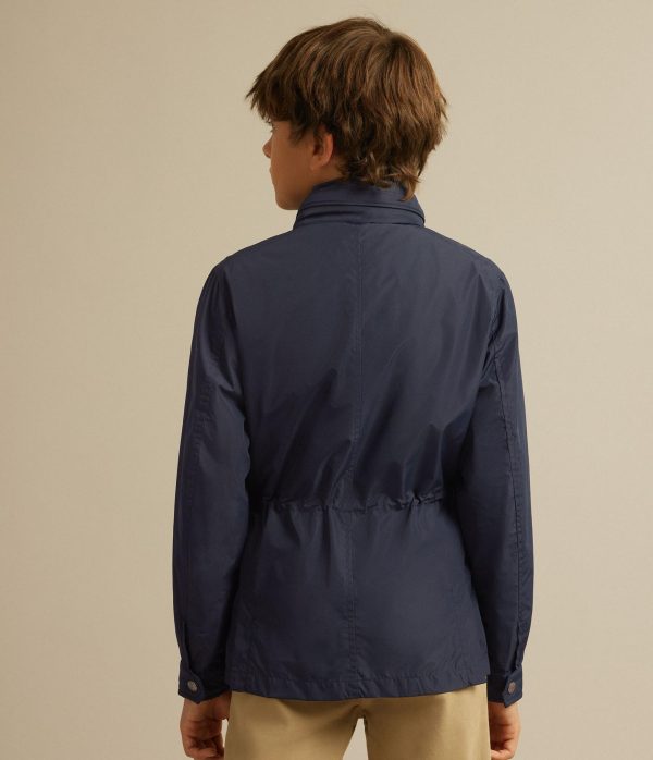 Cortavientos con cierre central mediante cremallera oculta por tapeta de botones a presión, cuatro bolsillos en el frontal y cinturilla con ajuste entallado. Puños ajustables y aberturas en el bajo de la espalda. Corte regular fit.