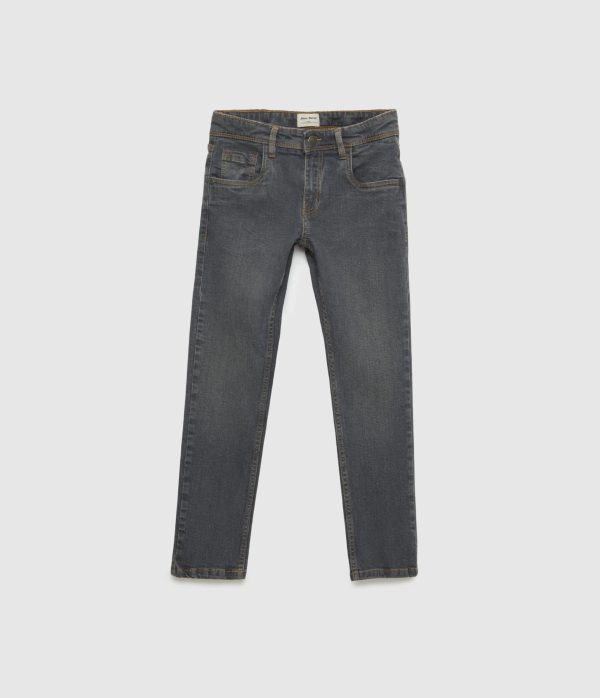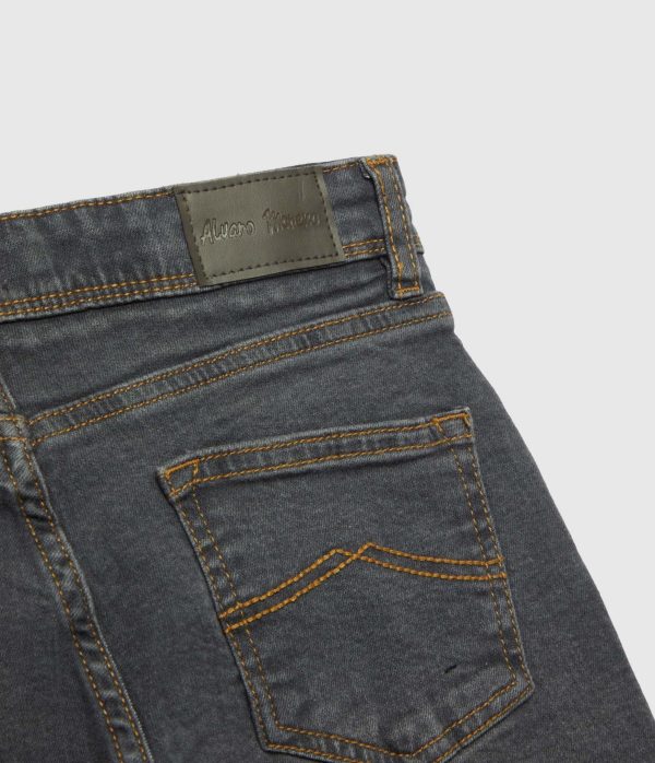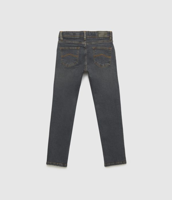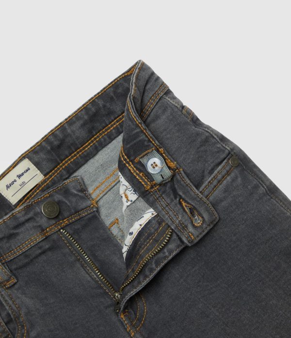 Pantalón denim con cinco bolsillos y cierre central mediante doble botón y cremallera, pespuntes en color camel, fornituras personalizadas y etiqueta en efecto piel en la cinturilla.